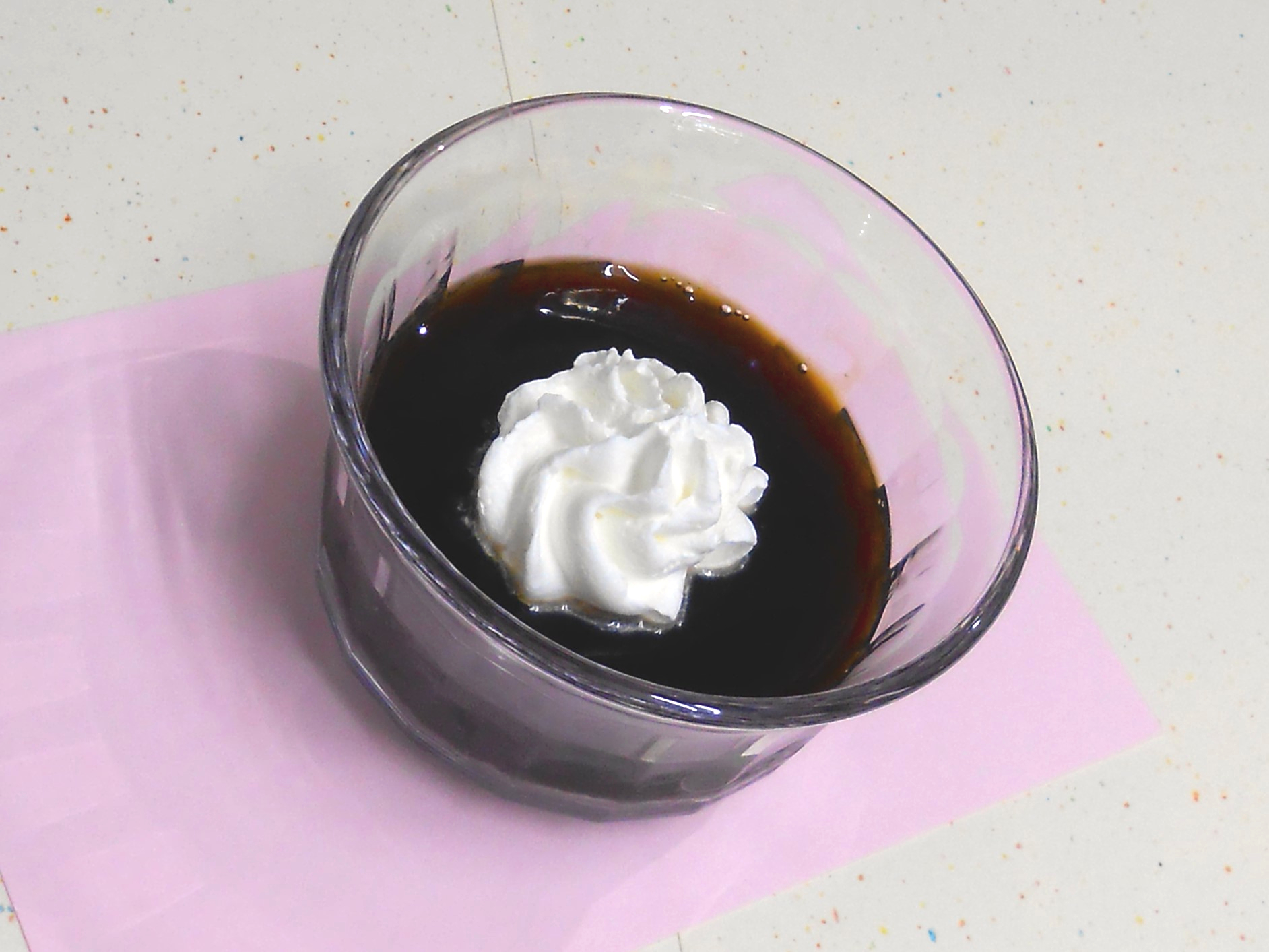 甘さ控えめに仕上げたほろ苦いコーヒー ゼリーにホイップクリームをトッピング しました。